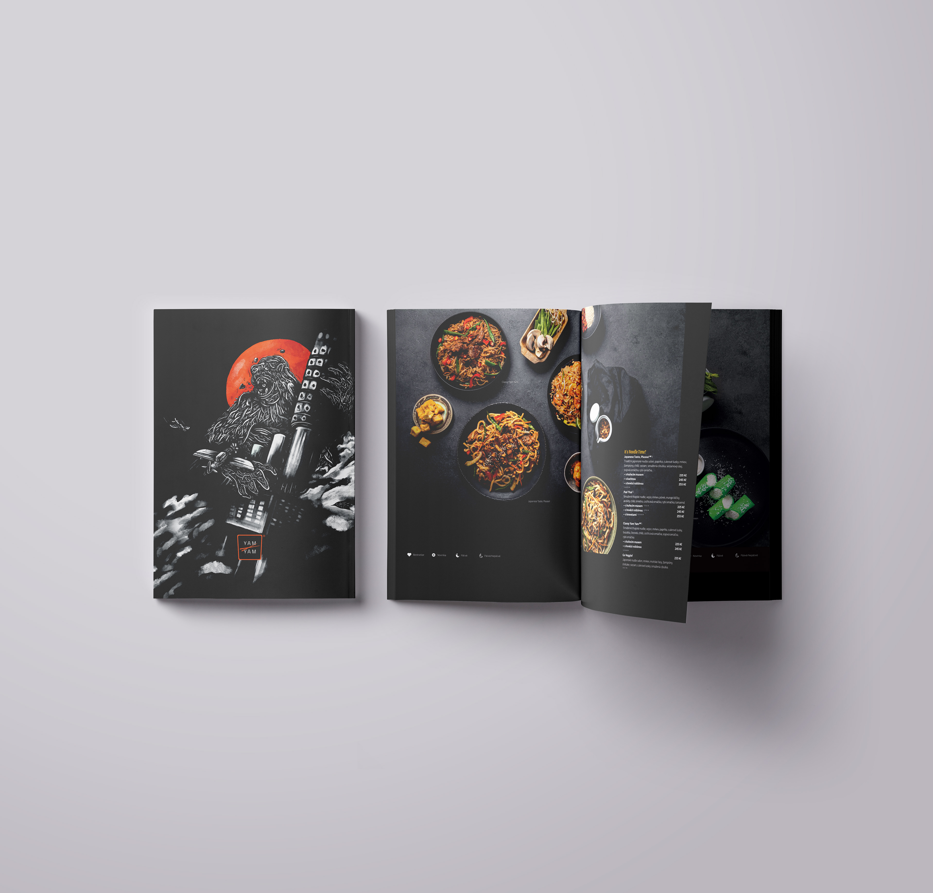 Návrh menu pro restaurace Yam Yam včetně fotografií, foodstylingu a ilustrace na obálku.